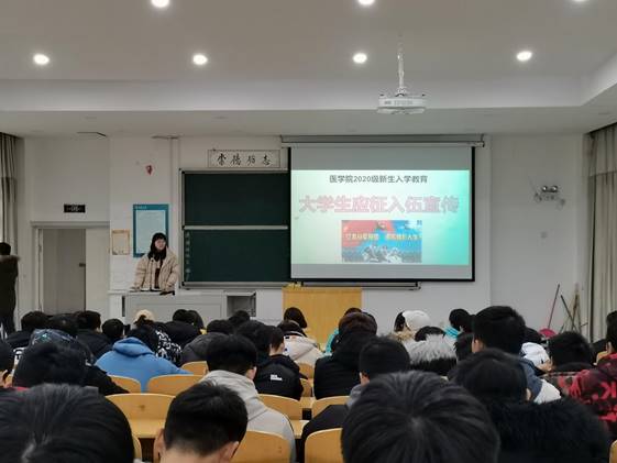 为了扎实做好我院大学生应征入伍工作,充分激发广大学生参军入伍热情,医学院于12月25日下午在教学楼A2-105开展2021(春季)大学生应征入伍宣传动员大会。本次大会由20级新生辅导员孙桐主持,医学院辅导员、全体在校男生和部分女生参加此次动员大会。