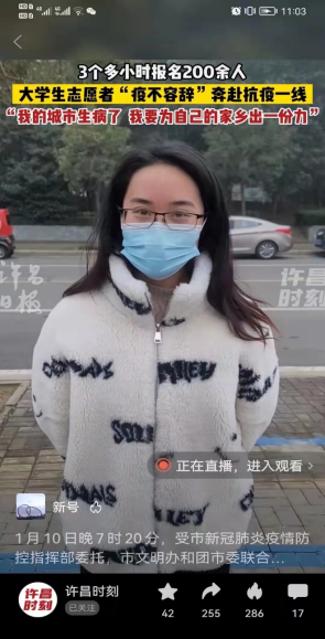 据了解,此次志愿活动时间紧任务重,要求志愿者协助医护人员将每天多达100万人次的检测信息扫码录入,这不仅要求志愿者政治觉悟高、纪律观念强,而且对志愿者录入设备的操作能力有一定的要求,同时还存在一定的防护风险。可能是受到了工作在一线医院姑姑的影响,也可能是因为妈妈对她支持,明知任务艰巨且危险的情况下,宋迎雪从微博上看到消息后毅然决然地第一时间报了名,她说,“长葛移动方舱实验室检测区需要20名志愿者,招募令发出后,三个多小时收到200余人报名。我很高兴也很自豪能成为这20分之一,为家乡疫情防控贡献力量。”简简单单的话语,书写着“冲锋在前”的时代担当。
