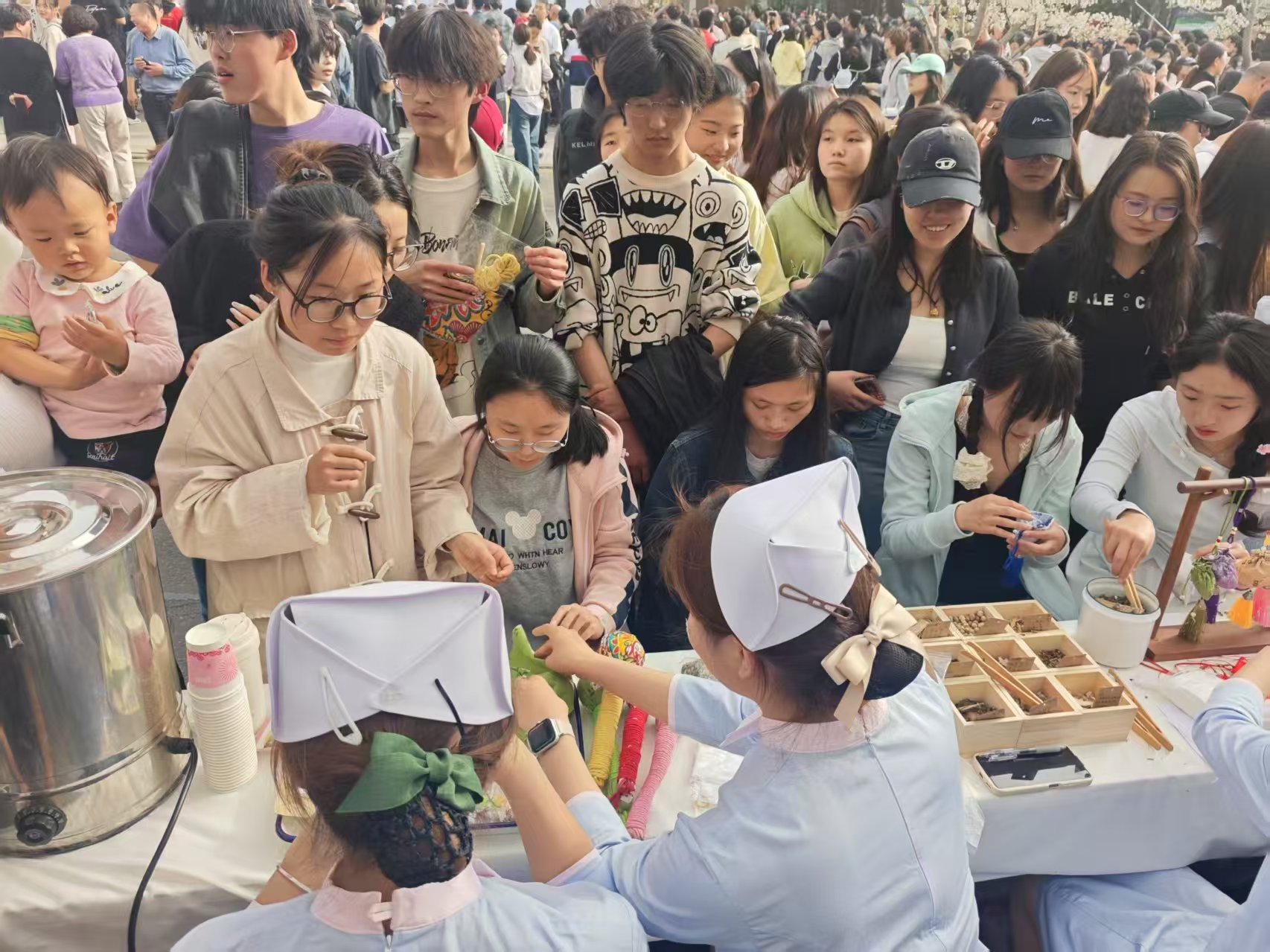 除了健康服务,展位上的“中医药文化体验区”同样人气高涨。医学社学生熬制中药茶饮,现场演示香囊、养生锤制作过程。参与者亲手填充艾叶、薄荷、丁香等药材,既感受了动手乐趣,又学习了中医药知识。