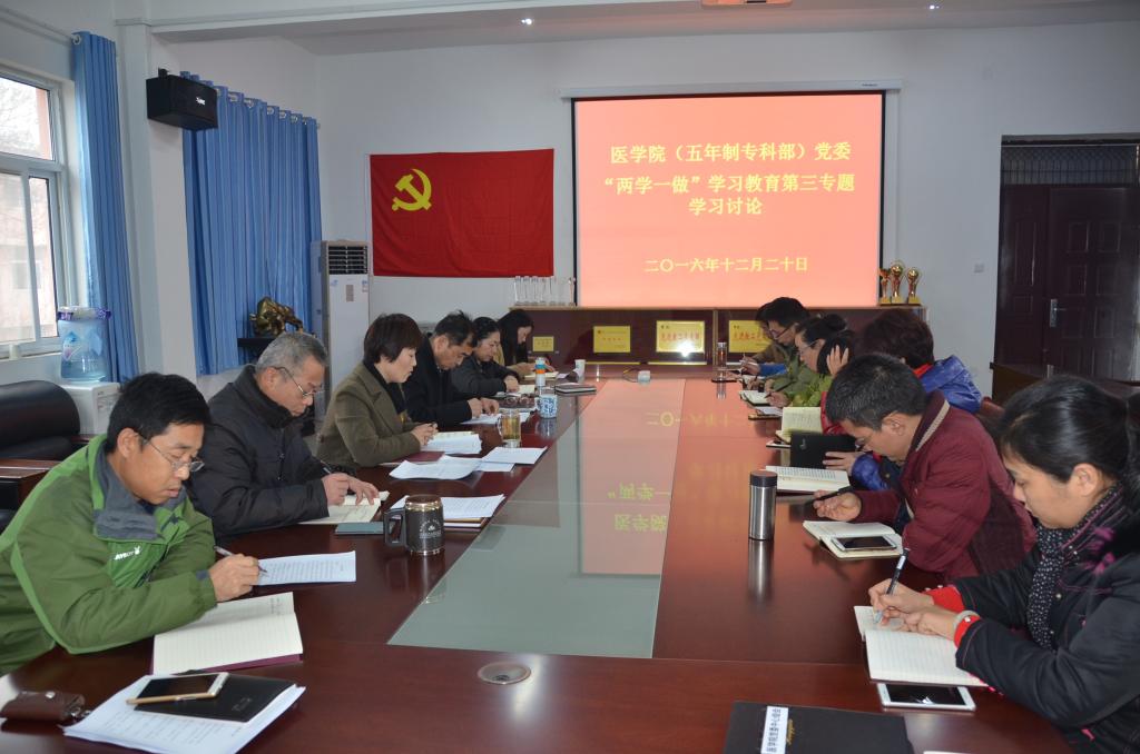 12月20日下午,医学院(五年制专科部)党委在会议室召开“两学一做”第三专题研讨会。医学院党委委员、各支部书记参加了会议。