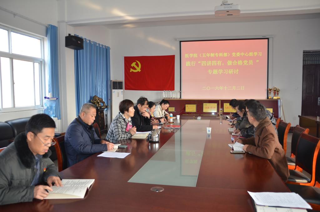 10月11日,医学院(五年制专科部)党委在三楼会议室组织了践行“‘四讲四有’做合格党员”专题学习研讨。全体党委委员及各支部书记参加了会议。会议由党委书记翟惠婷主持。