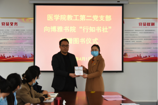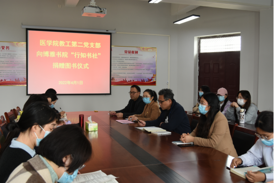 4月1日,图书捐赠仪式在博雅书院“行知书社”举行。医学院副院长陈丽平、博雅书院副院长牛磊及教工第二党支部教师和部分学生代表参加本次捐赠仪式活动。陈丽平副院长和牛磊副院长致词并对学生提出寄语:希望同学们在校期间能多读书、读好书,将来能成为精神富足、能力过硬的有用人才,为祖国的建设发展增砖添瓦。