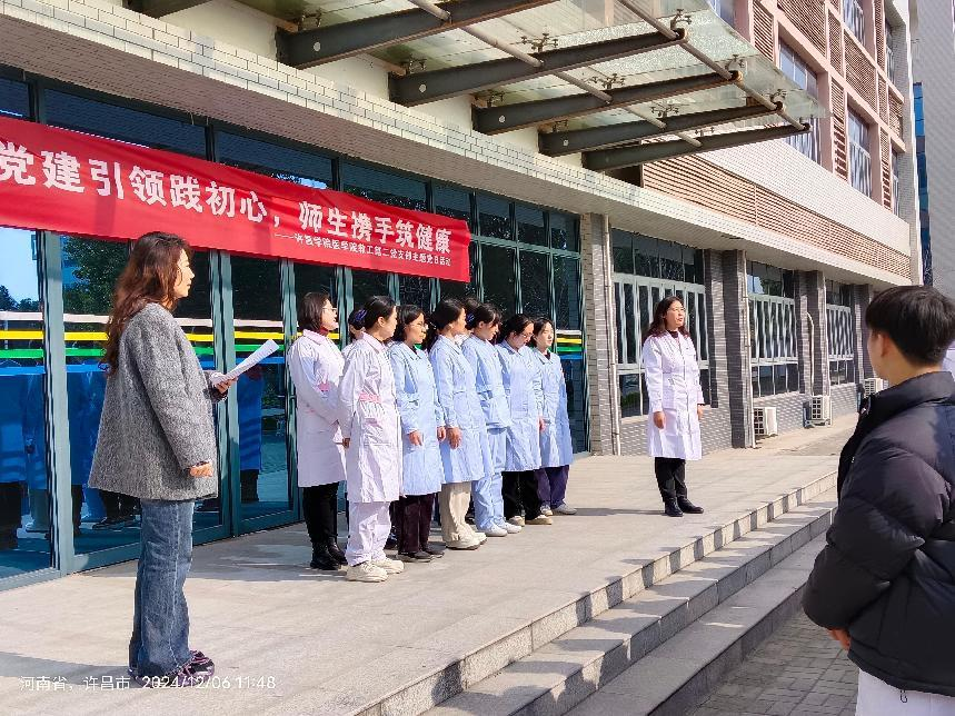 12月6日中午,我院教工第二党支部在兴华路校区C1楼前举行健康教育月启动仪式暨12月份主题党日活动,活动主题为“党建引领践初心,师生携手筑健康”。教工第二党支部全体教师及2022级护理学本科专业全体学生参加本次活动。活动由医学院副院长、教工第二党支部书记陈丽平主持。