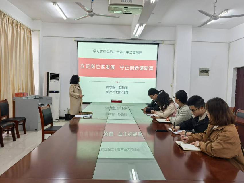 赵艳丽围绕党的二十届三中全会精神,以“立足岗位谋发展,守正创新谱新篇”为题,从深刻理解党的二十届三中全会的意义、坚持守正创新的内涵和守正创新、担当作为,推动学院学生工作高质量发展三个方面深入阐述。鼓励支部党员,一要立足本职,坚定理想信念,提高政治敏性,把稳政治方向,站稳政治立场;二要守正创新,练就干事本领,找准创新提升工作质效的结合点和立足点;三要勇挑重担,履职尽责,切实从实际出发,推动学生工作再上新台阶。