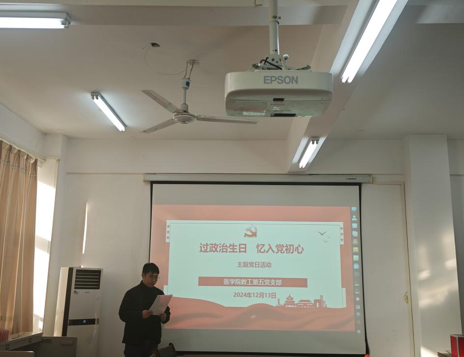 12月13日上午,我院教工第五党支部在医学院第三会议室开展党员集体“政治生日”主题党日活动,活动包括上“一次”集体党课、重温“一次”入党誓词、读“一封”入党志愿书、送“一份”生日礼物四个环节,院党委书记吴飞以党员身份参加本次活动。活动由党委副书记、教工第五党支部书记赵艳丽主持。