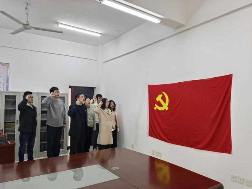 全体党员面对鲜红的党旗,紧握右拳,庄严宣誓,重温入党誓词,牢记使命担当。