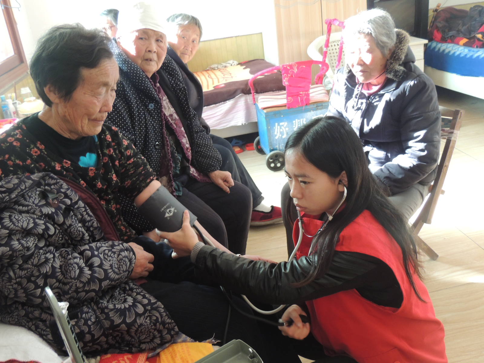敬老院的老人们由于各种原因儿女无法陪伴身边。为了减轻老人的寂寞,为老人带来欢乐,志愿者们来到屯里社区老年公寓进行志愿服务,陪老人们聊聊天、说说话,为老人们进行常规身体检查,与老人们共度短暂而温馨快乐的时光。