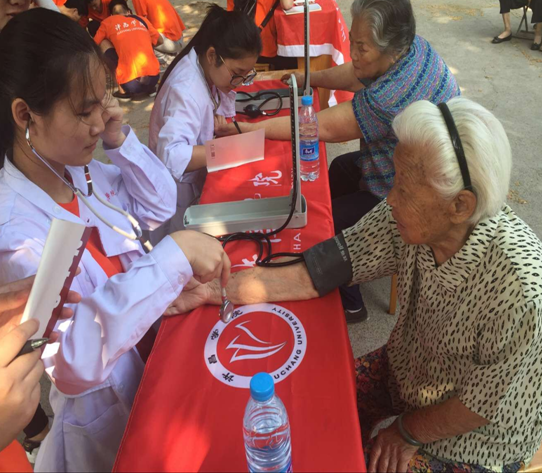 上午九时,作为校级综合服务队,我院爱心医疗社会实践队联合义务家维修社会实践队、法律援助社会实践队共同为“七一社区”的居民们开展义务服务。本社区的老人居多,平均年龄在75岁左右,最高达90岁以上的高龄,团队成员在炎炎烈日下用自己的专业知识认真的为老人测量血压,细心询问其饮食和运动情况,并做出相应的健康建议。成员们分为若干小组,有的为老人拉拉家常,讲笑话;有的聆听老人们过去的辉煌成就;通过谈心,队员们了解了老人的性格特点、生活习惯和健康情况,更有利于帮助老人健康、绿色的生活。