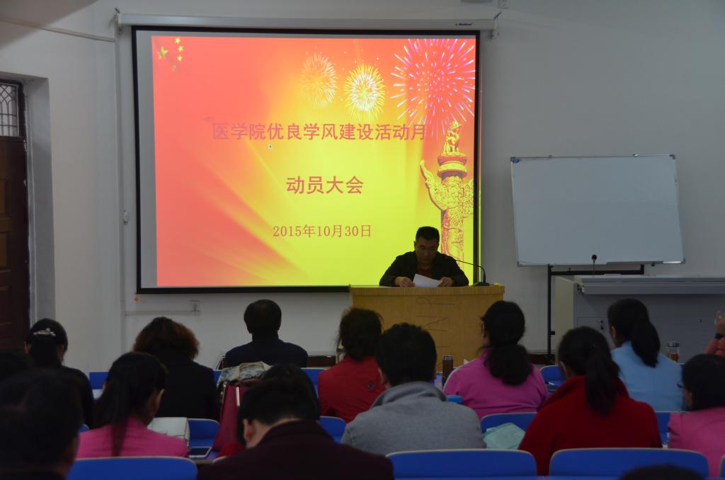 根据学校《关于开展2015年“优良学风建设活动月”的通知》,为进一步加强医学院学风建设,医学院于10月30日下午4:30在办公楼二楼202会议室召开2015年“医学院优良学风建设活动月”动员大会。全体院领导和全体专兼职教师参加会议,会议由院长艾旭光主持。