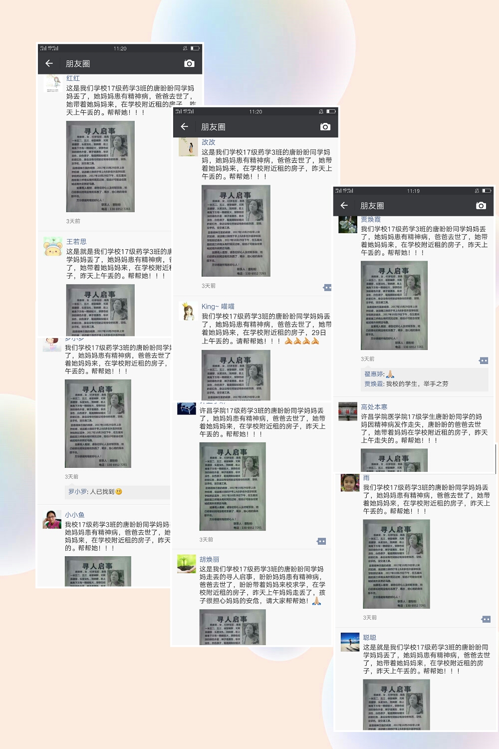 10月30日,“医学院2017级药学专业3班唐盼盼同学的母亲走失了。她的母亲患有精神疾病,她的父亲去世了,她带着母亲来上学,在学校附近租的房子,昨天上午丢的。请帮帮她!”这则寻人启事在微信朋友圈被多次转发。