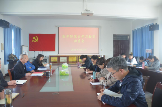 3月25日下午,在医学院办公楼311室,召开党史学习教育动员大会,传达学校党史学习教育动员大会精神,对医学院党史学习教育进行全面动员和部署。医学院领导班子、教工党支部书记和全体辅导员参加会议。