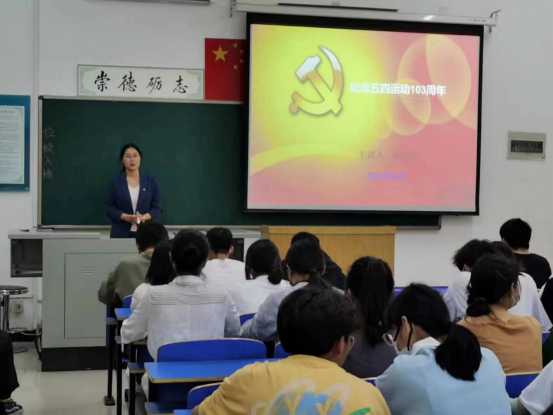 今年是五四运动103周年。4月26日晚,医学院副院长陈丽平以“纪念五四运动103周年”为主题,在教学楼B2-110教室为我院2021级医学检验技术专业本科生上了一堂生动的党课。
