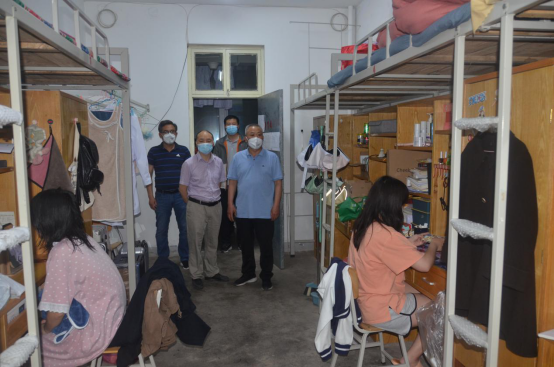 5月5日,我校疫情防控形势陡然严峻,李学峰院长按照学校工作要求即刻入住校区,会同康伟书记、陶战刚副书记、牛磊副院长投入到兴华路校区各项疫情防控工作中,在完成当天的信息排查、核酸检测等防控工作后,6点钟医学院领导班子组织医学院、保卫、后勤在校人员到各学生宿舍看望学生,进行心理安抚、疏导工作,引导学生传播正能量,进行正能量的舆论引导。巡查学生宿舍结束后,医学院领导班子连夜对兴华路校区疫情防控工作进行深入研判,安排部署5月6日的具体防控工作。