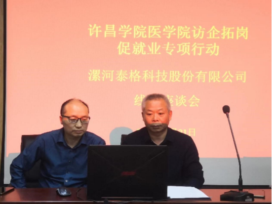 4月21日下午,与漯河泰格科技股份有限公司总经理吴英进行线上座谈。会上,医学院领导向漯河泰格科技股份有限公司重点推介本届毕业生,希望公司为他们提供更多适宜的岗位,共同促进毕业生高质量就业;还就校企合作、人才培养提出设想和方案。