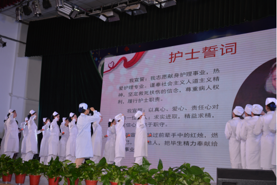 伴随着柔和的灯光与低缓轻柔的配乐,护理系30多名护生代表接受授帽礼,随后全体护生手持寓意着“燃烧自己,照亮别人”的奉献精神的蜡烛,在胡焕丽老师带领下进行了庄严而肃穆的宣誓,表达了发扬无私奉献精神,践行救死扶伤神圣使命的承诺和决心。