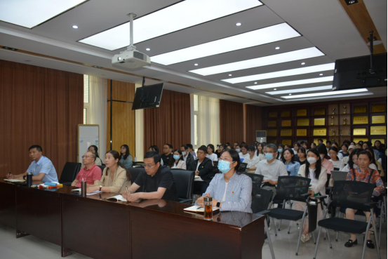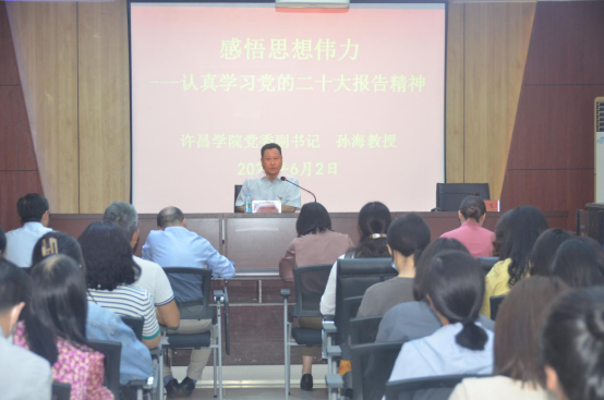为深入贯彻落实党的二十大精神,扎实推动学习贯彻习近平新时代中国特色社会主义思想主题教育走深走实,6月2日下午,我院特邀许昌学院党委副书记孙海教授为医学院、博雅书院师生作“感悟思想伟力——认真学习党的二十大报告精神”专题辅导报告。会议由医学院党委书记吴飞主持,医学院党委、博雅书院党委全体教工党员、学生代表共同参加学习。