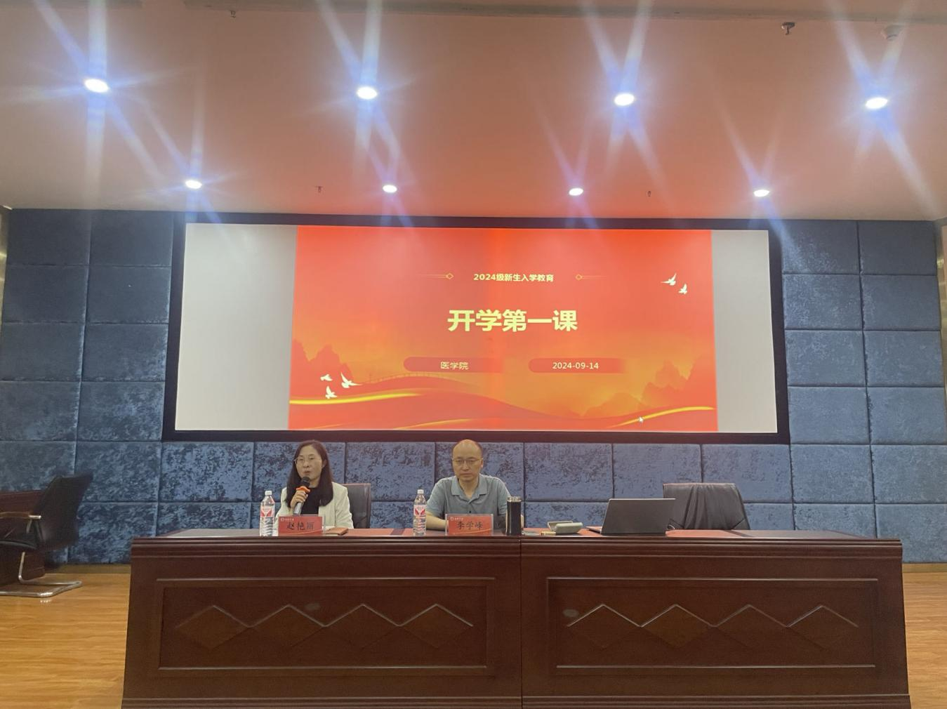 9月14日上午,医学院院长李学峰以《我的大学我做主--分享、感受与展望》为题在兴华路校区图书馆学术报告厅为2024级新生讲授开学第一课,新生代表180余人参加讲座。讲座由院党委副书记赵艳丽主持。