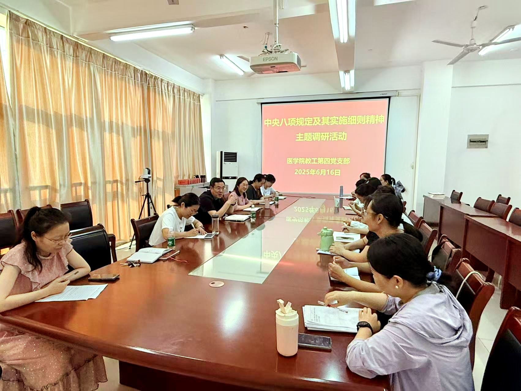 在调研中,吴飞听取了教工第四党支部工作情况汇报,与参会同志面对面交流,详细了解学习教育开展情况,广泛听取了大家在工作、生活中的困难以及对学院发展的意见建议。他强调,要找准支部党建和业务融合的切入点,坚持基层党建创新,竭力打造支部党建工作亮点;要深入学习习近平总书记关于加强党的作风建设的重要论述,以优良作风凝心聚力,真正把本次主题教育工作落到实处。他指出,医学院将持之以恒地贯彻落实中央八项规定精神,针对大家反馈的问题尽快梳理,制定切实可行的措施,着力解决制约学院发展和教师成长中的突出问题,借以推动学院工作再上新台阶。(审核:吴飞;摄影:安锦花)