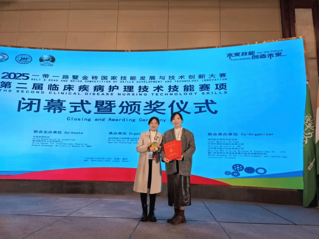 11月20——23日,“2025‘一带一路’暨金砖国家技能发展与技术创新大赛”第二届临床疾病护理技能赛项决赛在漯河医学高等专科学校举行,我院护理专业2023级赵占辉、刘多多、韩泞如、刘胜男四名同学组成的“智暖夕阳”团队获得高职组三等奖。