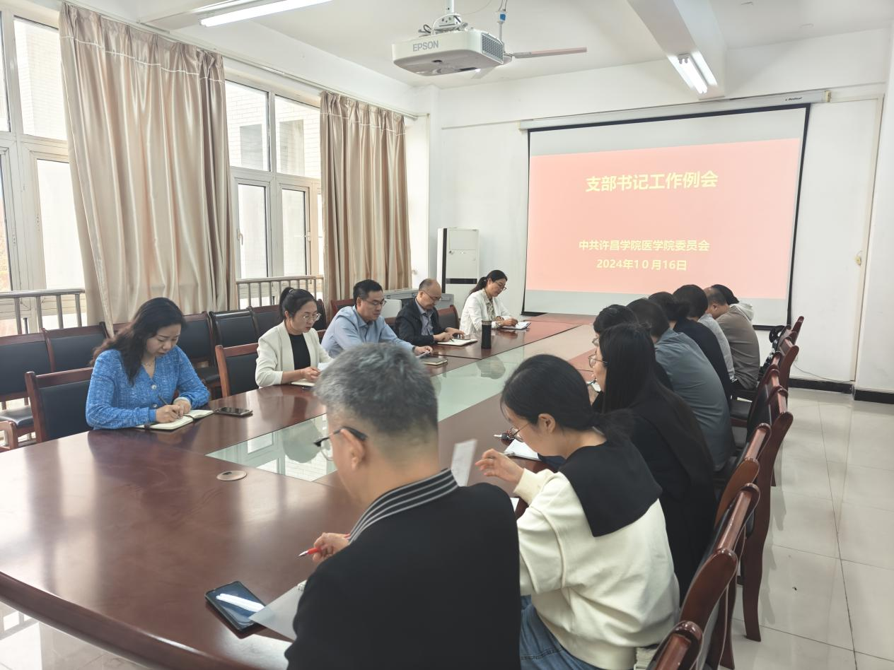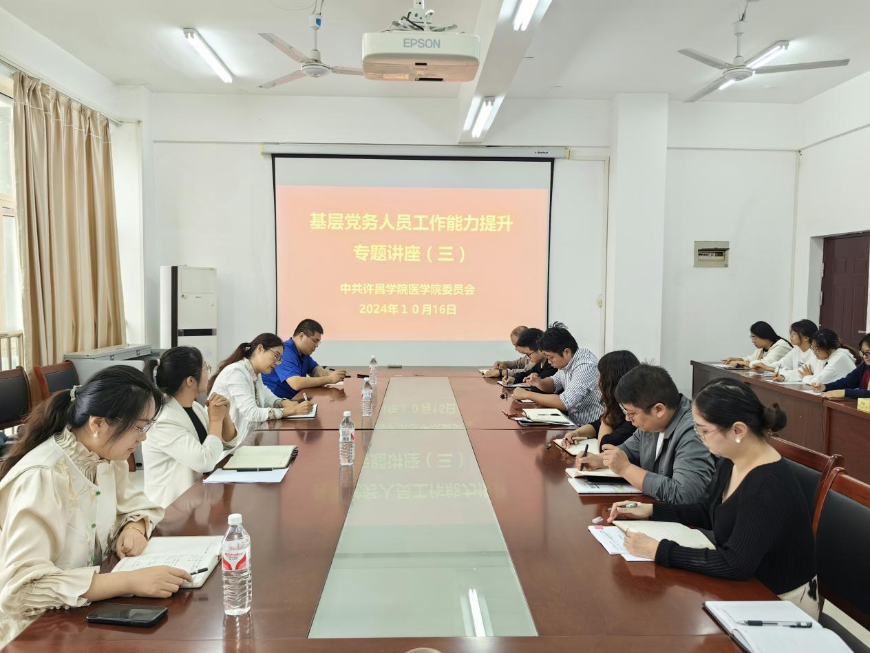 10月16日上午,我院在B楼三楼会议室召开医学院2024年基层党务人员工作能力提升专题讲座第三讲暨党支部书记工作会议。院党委书记吴飞、院长李学峰、党委委员、组织员、新一届教工及学生党支部委员参加会议。党支部书记工作会议由吴飞主持。