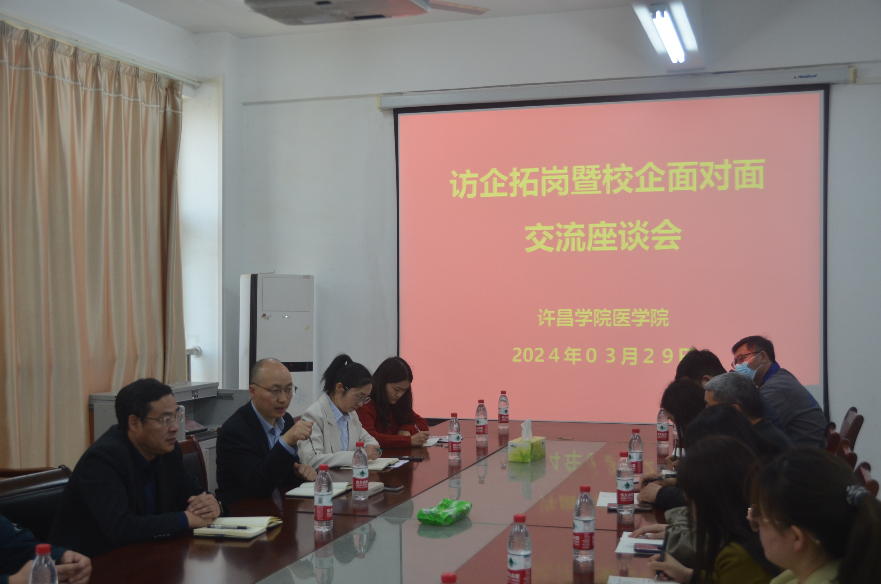 3月29日上午,我院在兴华路校区B楼三楼会议室开展访企拓岗暨校企面对面交流座谈会。医学院党委书记吴飞、院长李学峰、党委副书记赵艳丽、副院长陈丽平、副院长刘艳艳、就业专干及企业负责人参加本次座谈会。座谈会由党委书记吴飞主持。