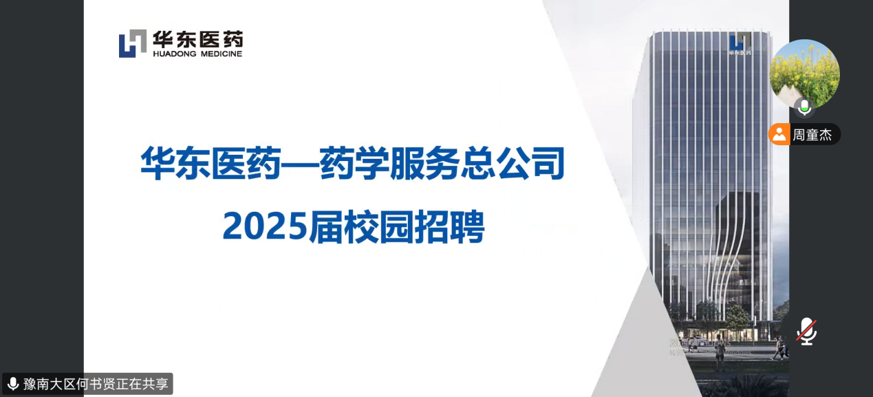 4月16日19点30分,华东医药旗下药学服务总公司 2025届线上校园招聘宣讲会顺利举行。会上,华东医药负责人详细介绍了药学服务行业的现状、公司未来发展规划、各类岗位用人需求、薪酬福利体系以及员工职业晋升通道。在线参与学生,就感兴趣的问题与企业代表积极互动交流。